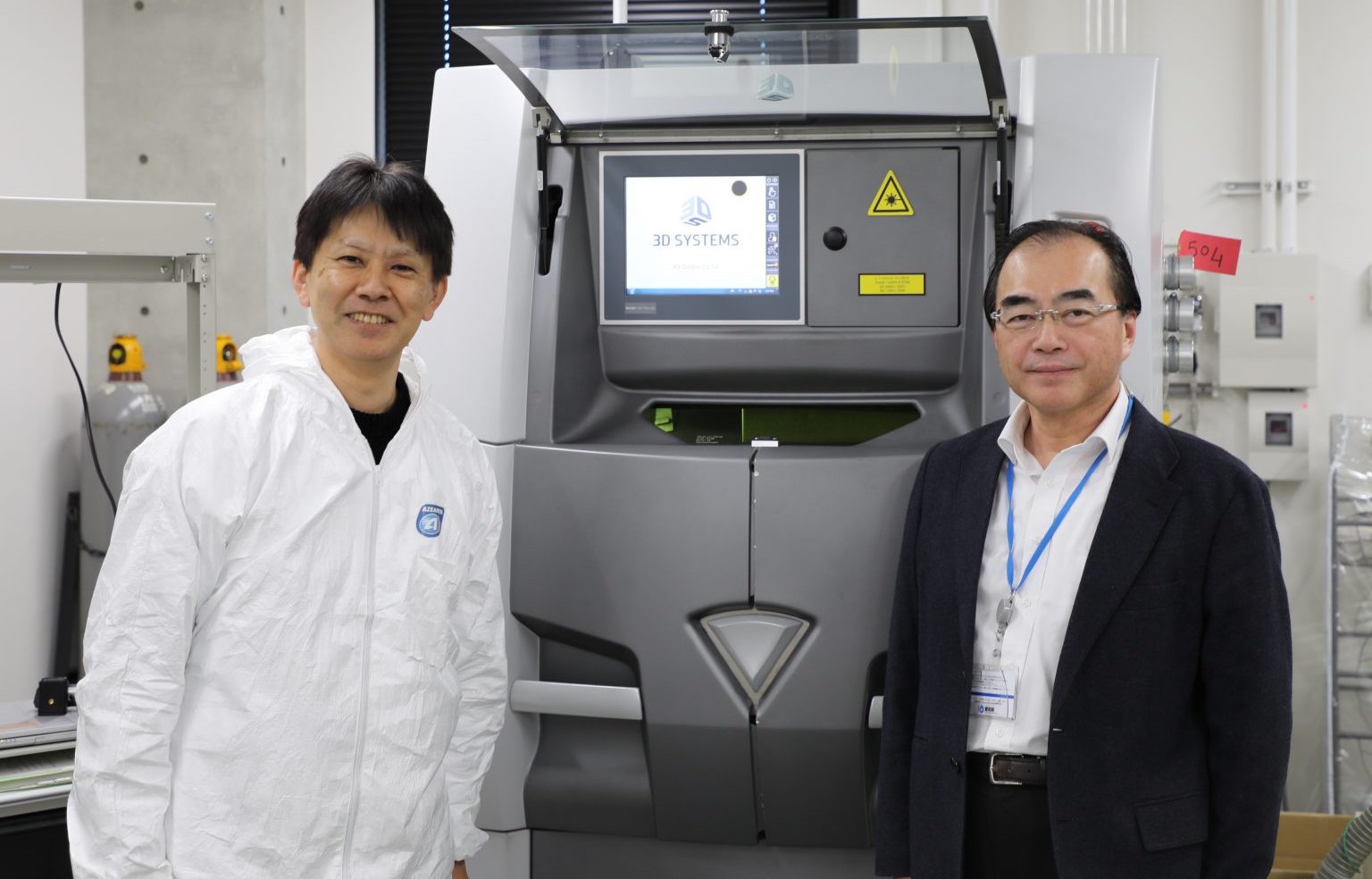 Naoki Takata, a professor at Nagoya University and the lead researcher on the project (left), and Masaki Kato, senior author and division head of Aichi Center for Industry and Science Technology (right), standing in front of the center’s laser 3D printet, which creates stronger, heat-resistant aluminum alloys layer by layer. (Photo: Merle Naidoo, Nagoya University.)