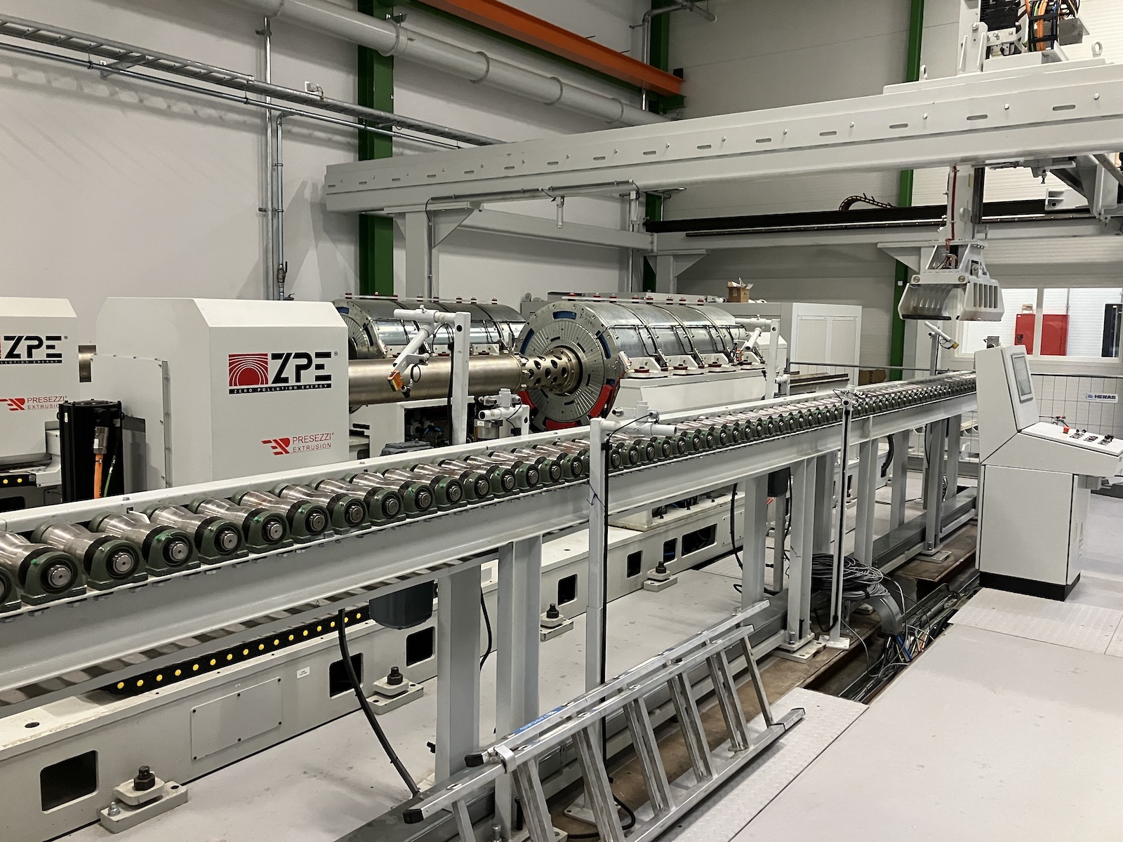 In addition, the press line features two magnetic induction heaters (8,500 kg/h) based on Presezzi’s Zero Pollution Energy (ZPE) heater technology (Figure 5), which provide low energy consumption compared to conventional systems like gas-fired furnaces. When the billet is loaded into the furnace it is blocked between a mechanical support—the reference point—and a movable stop, which adapts its position according to its length. Once the billet is locked, the furnace moves to cover the length of the billet before it begins the heating process.2 The billet is then heated by a magnetic field created during the rotation of the permanent magnets, which are assembled inside the rotor of a coaxial motor. The ZPE ovens automatically calculate and control the heating process, taking into account the alloy and the starting temperature to determine the exact processing time and speed to obtain the desired temperature.