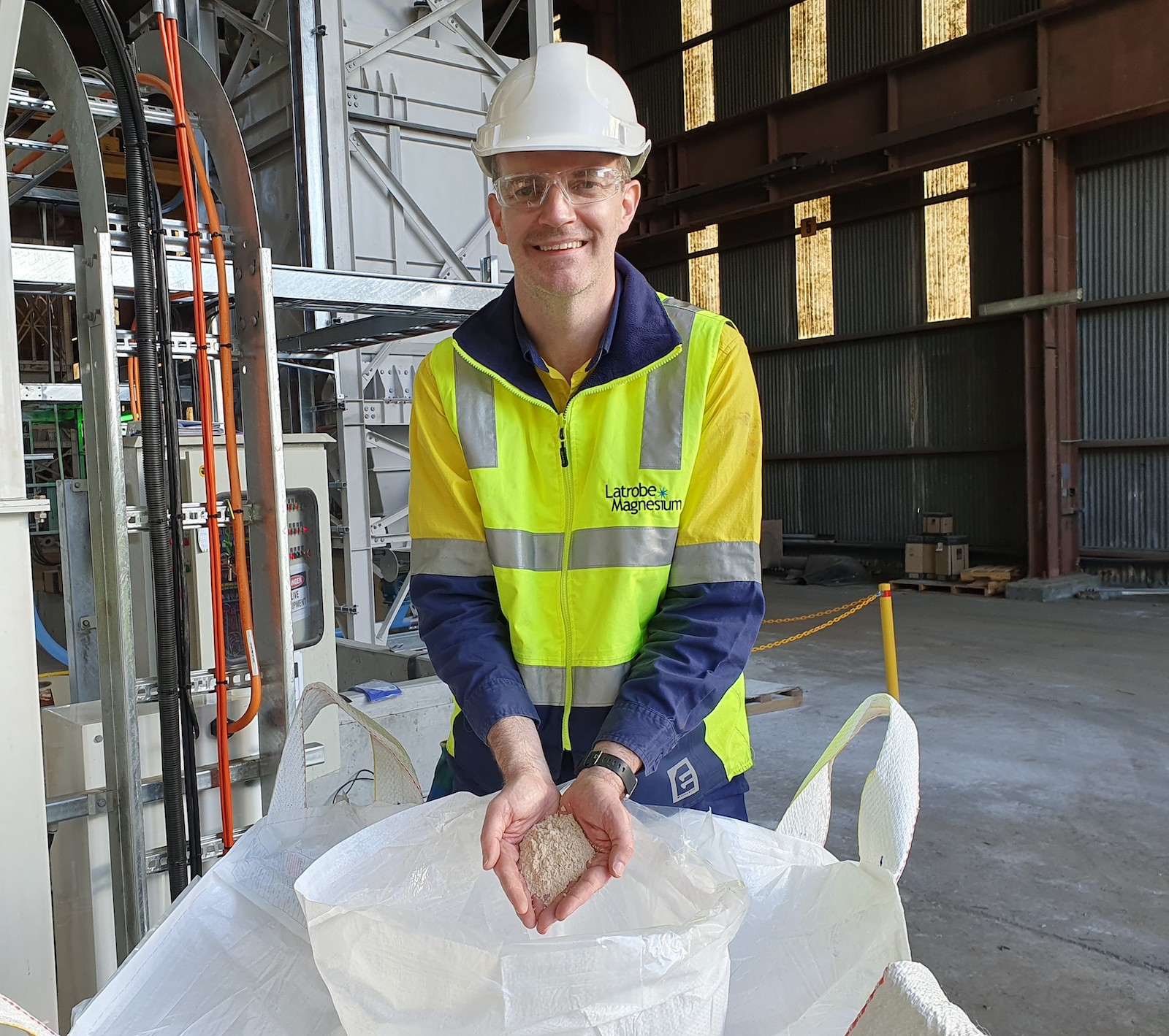 Figure 2. Ronan Gillen, COO of Latrobe, reveals a handful of magnesium oxide, which was successfully produced from brown-coal fly ash using Latrobe’s proprietary process. (Photo: Latrobe Magnesium.)