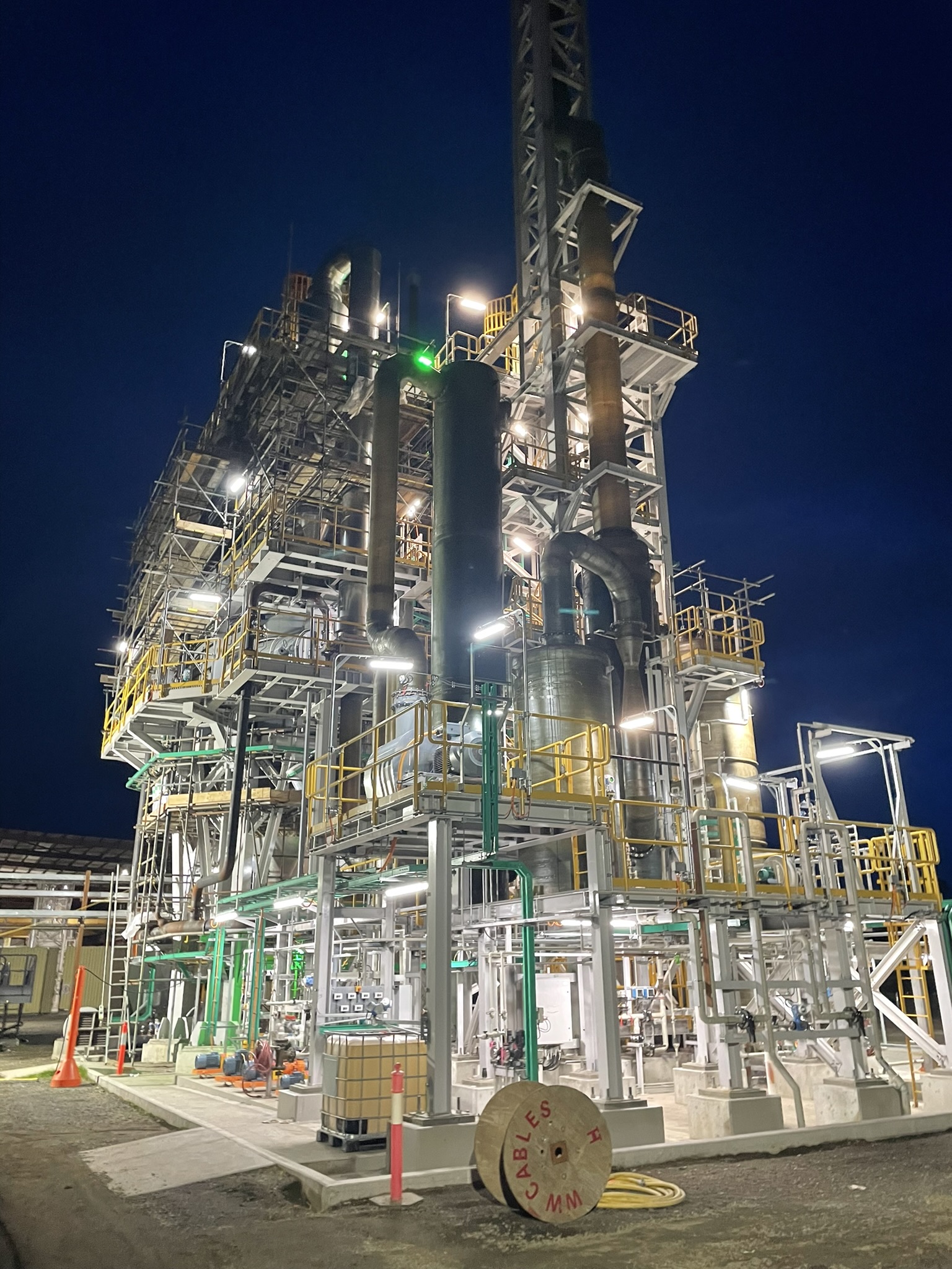 Figure 3. Latrobe Magnesium’s Stage 1 Demonstration Plant, showing the spray roaster at night. (Photo: Latrobe Magnesium.)