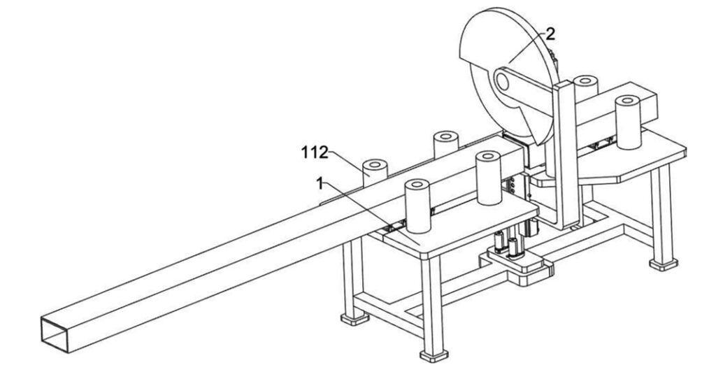 CN119328216B — Aluminum product shearing equipment — Jiangsu Daiwen Exhibition Co., Ltd. (China) — The invention relates to the field of aluminum shearing, and in particular to shearing device for aluminum display rack processing. It includes a workbench, a cutting device, a driving assembly, an electromagnet, a magnetic sheet, a push rod I, a rotating block I, a support rod, a telescopic rod and a support block. The workbench is fixedly connected to the driving assembly, the driving assembly is connected to the cutting device, the driving assembly is connected to the electromagnet, the electromagnet is magnetically connected to the magnetic sheet, the magnetic sheet is fixedly connected to the support rod, and the support rod is connected to the rotating block I. The rotating block I is rotatably connected to the telescopic rod and the telescopic rod is connected to the support block. The invention supports the inside of the aluminum bar through the support block, so that the cut part of the bar cannot bend and deform inward.