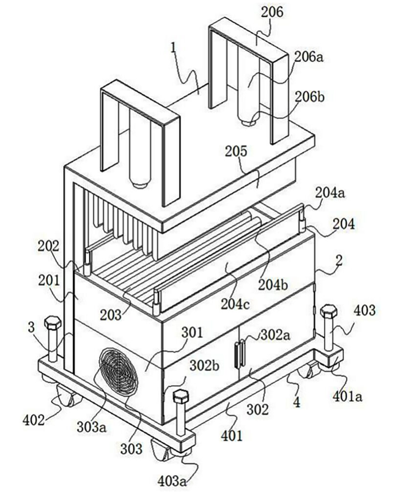 US12326215B2 — Tablet stand with aluminum cooling unit — Shenzhen Zhenting Trading Co Ltd (Canada) — Tablet stands are designed specifically for tablets to improve the comfort and convenience of using tablets in various environments and occasions. The angles of the popular tablet stands on the market are usually adjustable according to personal preferences and needs. However, given the limited battery life of tablets, users often need to recharge tablets during use. When the tablet is connected to the charging cable, adjusting the angle of the stand or moving the stand may interfere with the charging cable, resulting in poor contact of the charging cable and the tablet. This may force users to frequently reconnect the charging cable, which may damage the charging cable and the tablet’s charging port. To overcome these defects, this invention provides a tablet stand, which includes a charging device that can be connected to an external power supply. Putting a tablet on the said tablet stand then recharges the tablet, without interference even if users move the stand or adjust its angle. Further, when the tablet is put on the supporting assembly, the aluminum cooling unit (21) can help the tablet dissipate heat.