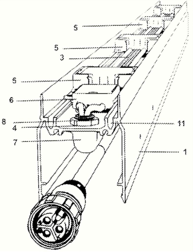 US12348015B1 — Aluminum profile system for laying power and communication lines — Vladimir Afanasiev (Russia) — The invention, relating to the field of electrical engineering, proposes a profile system for laying power and communication cables. It comprises a guide profile housing that accommodates a permanently fixed cable harness of insulated linear cables. The profile housing includes a base with openings at both ends for integrating switching cable assemblies with various connectors, and a decorative cover. It is recommended to make the base and the decorative cover from an extruded aluminum profile, ensuring lightness, rigidity and strength of the structure, and thereby allowing it to be mounted on building facades.