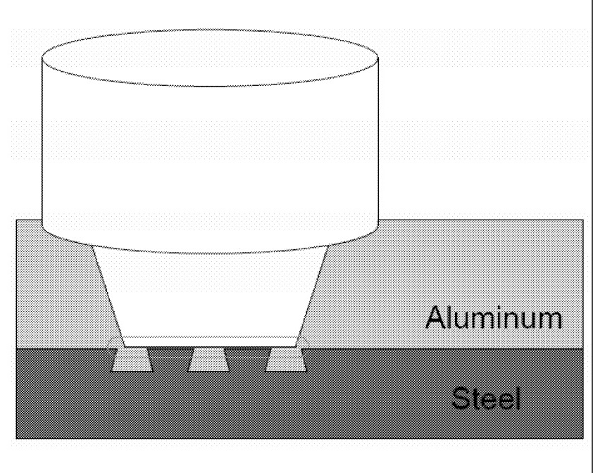 US12459052В2 — Methods for friction stir welding involving dissimilar materials — Battelle Memorial Institute (USA) — This invention centers around the joining of dissimilar materials by utilizing a combination of embedded portions of a first material within a preformed geometric shape or groove located in another material under process conditions and tooling geometries able to form an intermetallic interconnection or layer at the dissimilar interface within the preformed shape or groove. Joining metals with different melting temperatures can be accomplished by extruding a lower melting temperature material into grooves in a higher melting temperature material while simultaneously forming a metallurgical bond within the groove at the interface between the dissimilar metals. Joints with this configuration exhibit superior strength and ductility compared to other known techniques for the friction stir welding (FSW) of aluminum to steel.
