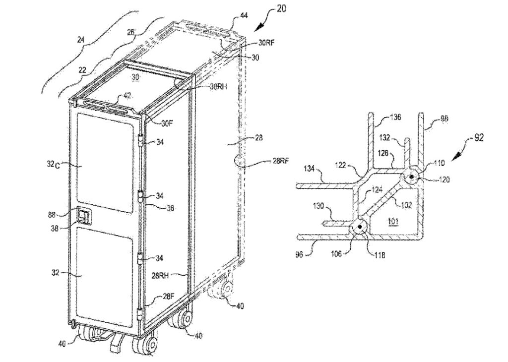 US12479485B2 — Thermal cart — Bucher Aerospace Corporation (USA) — A thermal cart for the in-flight distribution of consumables comprises an enclosure formed by thermally insulating material, including two side panels, a top and bottom panel, at least one door frame, and a door in each frame. A rear panel is provided in half-size carts where only one door and door frame are provided. Full-size carts have a rear door frame and rear door instead of a rear panel, as used in the half-size cart. Frame assembly aluminum extrusions may join adjacent panels, and an inner elastomeric extrusion is provided with each frame assembly extrusion, to provide a seal with the thermoplastic inner lining.