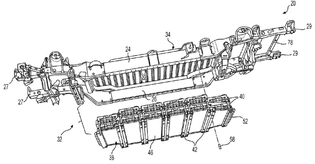 US12502944B2 — Frame assembly and integral battery structure — Magna International, Inc. (Canada) — A frame assembly for an automobile includes a pair of front frame rails set in a spaced relationship with a pair of rear frame rails. An upper cover is connected to and extends between the pair of front frame rails and the pair of rear frame rails to define a roof portion. The upper cover includes a pair of longitudinal sidewalls and a pair of cross sidewalls each extending downwardly from the roof portion to define an upper pocket bounded by the roof portion, the longitudinal sidewalls and the cross sidewalls. A base plate includes a plate portion for supporting at least one battery module. The base plate is connected with the upper cover for at least one battery module within the upper pocket. This patent covers a frame assembly that includes a battery housing that is at least partially integrated with a frame of an automobile, and the method of assembling the frame.
