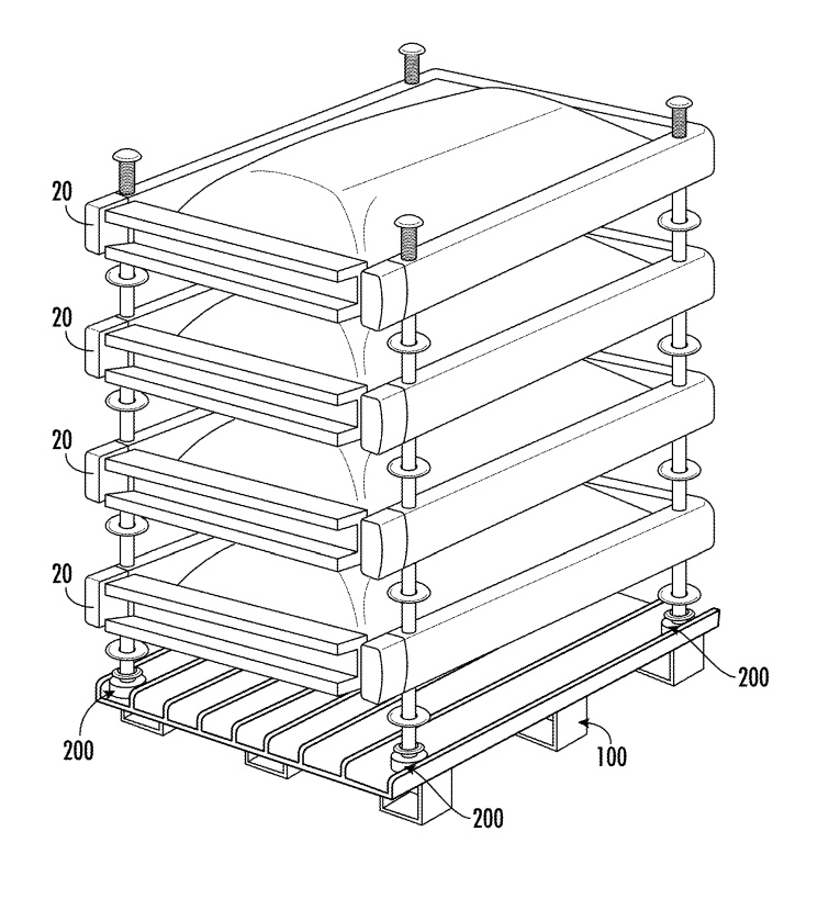 US12515846B2 — Bulk shipper pallet and isolator for bulk freezing applications — Sartorius Stedim North America, Inc. (USA) — An isolator includes a first section, second section, and a third section. The first section is configured to secure the isolator in a mount that is defined through a mounting section. The second section is disposed over the first and is configured to be supported by a first surface of the mounting section. The third section is disposed atop the second section such that the second section is sandwiched between the first and the third sections. The second section dampens forces exerted on the third section or the first section from being transmitted there between. A method for manufacturing a pallet that is configured to be frozen is also disclosed. This includes friction stir welding along a first joining edge and second joining edge that are abutted together to joined together to form a first segment.