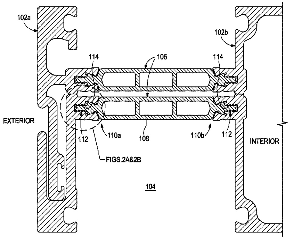 US12540502B2 — Fenestration thermal break design — Arconic Technologies, LLC (USA) — A profile for a fenestration system includes first and second members, and a thermal break extending between the two members. The thermal break is coupled to the first member at a thermal break interconnection that includes a tab extending laterally from a body. The tab includes a head extending from the body and a stem extending from the head. A channel is defined between upper and lower flanges of the first member and provides a first chamber that is sized to receive the head, and a second chamber extending from the first chamber and sized to receive the stem. The head is larger than the stem, and the first chamber is larger than the second chamber. The thermal break is temporarily secured to the channel by advancing the tab into the channel, and is permanently secured to the channel by crimping the flanges against the tab.