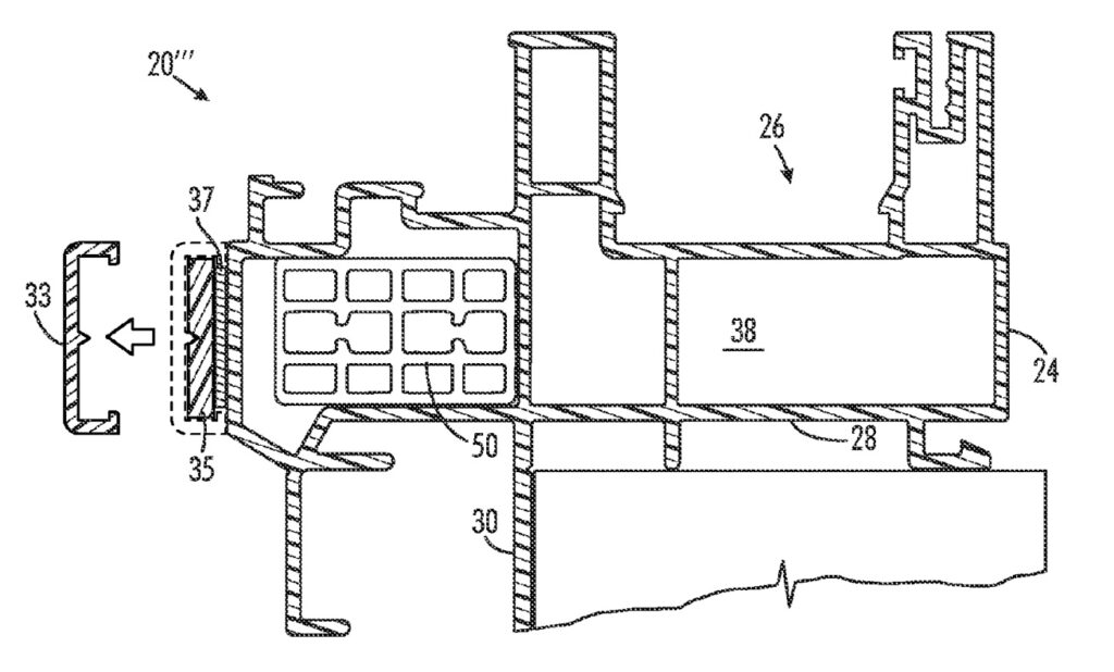 US12442184В2 — Assembly and method for attaching extruded members — SAS Systems Australia PTY LTD (Australia) — This patent relates to the assembly of extruded members, and includes an extruded housing member including one or more holes formed along at least one side thereof for entry of ends of one or more second extrusions therethrough, and at least one extruded aluminum clamping member including one or more pairs of opposed clamping portions for clamping the ends of the one or more second extrusions therebetween.