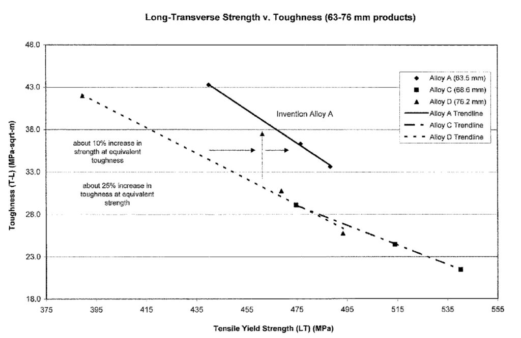 US12565695B2 — 2xxx series aluminum lithium alloys — Arconic Technologies, LLC (USA) — Thick wrought 2xxx aluminum lithium alloy products are disclosed in this patent. In producing aluminum alloys, improving one property of an alloy without degrading another often proves elusive. For example, it is difficult to increase the strength of an alloy without decreasing the alloy’s toughness. Other properties include corrosion resistance and fatigue crack growth rate resistance, to name two. Broadly, this patent relates to thick wrought 2xxx aluminum lithium alloy products having improved properties. Generally, the thick wrought 2xxx aluminum lithium alloy products have 3.0 to 3.8 wt. % Cu, 0.05 to 0.35 wt. % Mg, 0.975 to 1.385 wt. % Li, where -0.3*Mg-0.15Cu+1.65≤Lis-0.3*Mg-0.15Cu+1.85, 0.05 to 0.50 wt. % of a grain structure control element selected from the group consisting of Zr, Sc, Cr, V, Hf, other rare earth elements, and combinations thereof, up to 1.0 wt. % Zn, up to 1.0 wt. % Mn, up to 0.15 wt. % Ti, up to 0.12 wt. % Si, up to 0.15 wt. % Fe, up to 0.10 wt. % of any other element, with the total of these other elements not exceeding 0.35 wt. %, the balance being aluminum. Thick wrought products incorporating such alloy compositions achieve an improved combination of strength and toughness.