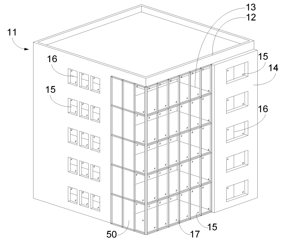 US12565773B2 — Lightweight thermal barrier panel and anchor system for building envelopes and method for installing — StudioTJOA, Inc. (USA) — This invention relates to a building envelope and window glazing attachments, specifically creating a thermal barrier or barriers opposite a new or existing building envelope consisting of opaque, transparent or translucent assemblies or a combination therein. This is to capture and contain air for use as a thermal insulator to increase the thermal resistance across the building envelope coupled with ventilation strategies to enable the ventilation of the cavity air when required. The system includes a modular panel with an infill barrier and structural anchors. The anchors are attached to the new or existing building envelope on at least one side of the building envelope to receive the thermal barrier panel to create an air cavity between the panel and the building envelope. The thermal barrier panel framing includes openings within rigid framing members to promote ventilation of the air cavity to at least one side of the thermal barrier panel.