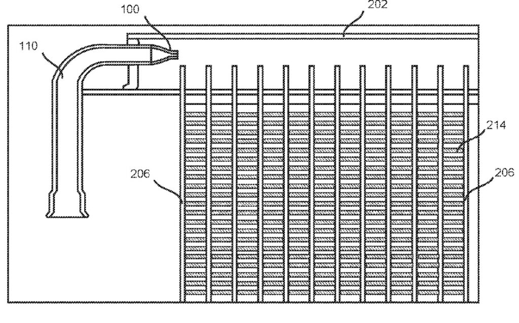 US12566035В2 — Simple distributor for inlet manifold of microchannel heat exchanger — Carrier Corporation (USA) — The distributor comprising a nozzle is adapted to be fluidically connected to a supply tube of a refrigeration line of the heat exchanger, wherein the supply tube is at least partially disposed within an inlet manifold of the heat exchanger. The nozzle comprises a first hollow portion having a round cross-section and adapted to be fluidically connected to the supply tube, and a second hollow portion having an oval or elliptical cross-section. The second portion is fluidically connected to the first, such that the nozzle transitions from the first portion to the second portion and the flow area of the nozzle reduces in a direction from the first portion to the second portion.