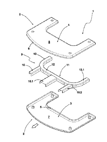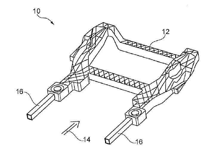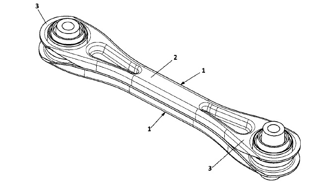 US9956838 — METHOD FOR OBTAINING A SUSPENSION ARM FOR AUTOMOTIVE VEHICLES AND SUSPENSION ARM — Engineering Developments for Automotive Industry, S.L. (Spain) — The present invention relates to a method for obtaining a suspension arm for automotive vehicles which allows reducing the costs and weight, in addition to improving the mechanical characteristics of the arm, physically attaching the connecting elements of the arm, either ball and socket or elastic joints, that are housed at the ends of said arm. This disclosure relates to methods for obtaining a suspension arm for automotive vehicles, wherein certain embodiments comprise obtaining two identical parts to form a body, where each part is obtained by means of: a) cutting a metal or composite sheet forming a base plane, such that a central segment and two ends are defined, b) drawing at least one hole in each end, c) stamping each part forming in its central segment two flanges consisting of a first flange and a second flange located on opposite sides of the central segment and oriented perpendicular to the base plane, where said flanges have an asymmetrical arrangement with respect to a midplane passing through the geometric centers of the holes of the two ends and is perpendicular to the base plane, the second flange being separated from the midplane a distance equal to the separation of the first flange from the midplane plus a distance at least equal to the value of the thickness of the sheet or plate.