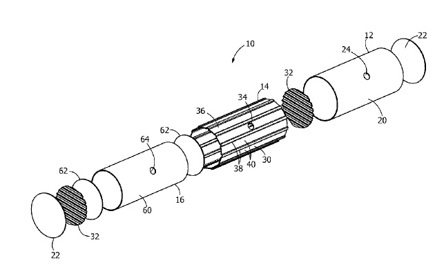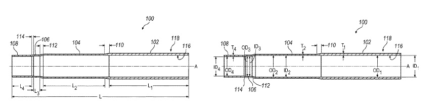 US10040108 — TUBULAR STRUCTURE SUPPORT WITH VARIABLE DIMENSIONS AND MECHANICAL PROPERTIES — L&W Engineering (USA) — A support may include a hollow metallic tube extending over an axis and may include two opposing ends. The tube may include a plurality of sections disposed along the axis. A first section may be disposed at an end of the tube and include a first inner diameter, a first outer diameter, and a first wall thickness. A second section may be separated from the first section via a first transition zone. The second section may include a second inner diameter, a second outer diameter, and a second wall thickness. A third section may be disposed remote from the first section and be separated from the second section via a second transition zone. The third section may have a third inner diameter, a third outer diameter, and a third wall thickness. The wall thickness, inner diameter and outer diameter may vary along the tube between the plurality of sections. For example, some applications may include, but not limited to, structural components for vehicles, industrial equipment, building, infrastructural and architectural components, commercial and residential components, road guard rails and light posts, to name a few.