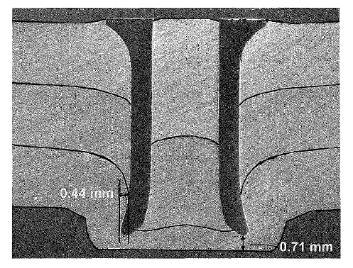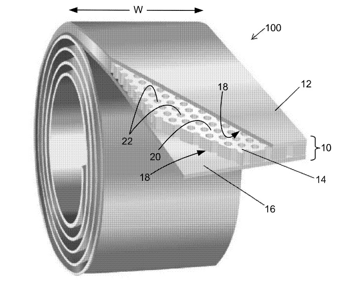 US9889632 — METAL LAMINATE WITH METALLURGICAL BONDS AND REDUCED DENSITY METAL CORE LAYER AND METHOD FOR MAKING THE SAME — Materion Corporation (USA) — A stiff, lightweight metal laminate includes a first continuous metal layer, a second continuous metal layer, and a reduced density metal core layer disposed between the first and second continuous metal layers. The core metal may be aluminum, copper, titanium, stainless steel, carbon steel, or an alloy thereof. The first continuous metal sheet may comprise aluminum, copper, titanium, carbon steel, stainless steel, or an alloy thereof; and the second continuous metal sheet may comprise aluminum, copper, titanium, carbon steel, stainless steel, or an alloy thereof. The reduced density metal core layer comprises a core metal and has an average density that is less than the density of the core metal. Planar metallurgical bonds secure the first and second continuous metal layers to the reduced density metal core layer. The metal laminate may be manufactured by press rolling the reduced density metal core layer sandwiched between the two continuous metal layers, after removing or overcoating the native oxide layer on each layer surface that contacts another layer in the metal laminate.