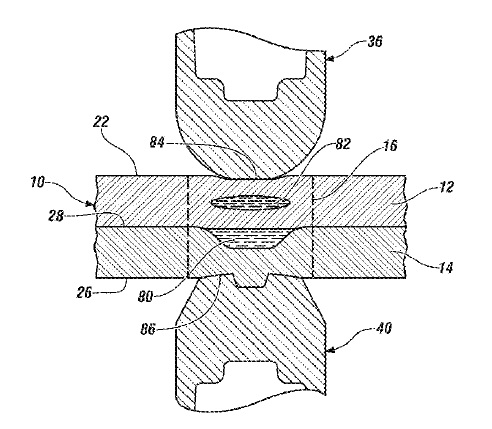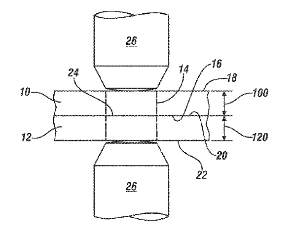 US9957584 — METHOD AND SYSTEM FOR ENHANCING RIVETABILITY — Ford Motor Company (USA) — A joined sheet stack and a method and system for forming the stack are disclosed. The stack may include a steel sheet and a second sheet formed of a 5xxx, 6xxx, or 7xxx aluminum alloy. The steel sheet may include a bulk portion having a first tensile strength and one or more fastener regions having a second tensile strength that is lower than the first tensile strength and a microstructure that includes tempered martensite. A fastener may extend through each fastener region joining the steel sheet to the second sheet. The method may include heat treating one or more regions of a steel sheet to form one or more fastener regions having a tensile strength that is lower than a bulk tensile strength of the steel sheet and a microstructure that includes tempered martensite. A fastener may then be inserted into the one or more fastener regions to join the steel sheet to a second sheet.