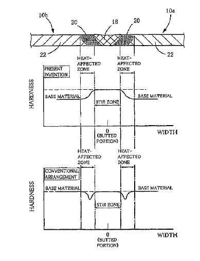 US10016837 — METHOD OF JOINING HEAT-TREATABLE ALUMINUM ALLOY MEMBERS BY FRICTION STIR WELDING — UACJ Corporation (Japan) — The present invention relates in general to a method of joining heat-treatable aluminum alloy members by friction stir wielding and a joined product for press forming obtained by the method. More particularly, the invention relates to such a method capable of advantageously providing a joined product with good ductility, accordingly with good press formability while effectively preventing occurrence of fracture at a stir zone and heat-affected zones of the joined product obtained as a result of joining the heat-treatable aluminum alloy members by friction stir welding, and such a joined product for press forming advantageously produced by the method. A method of joining heat-treatable aluminum alloy members by friction stir welding, including the steps of: a T4-treatment-performing step of performing a T4 treatment on heat-treatable aluminum alloy members so as to impart T4 temper to the heat-treatable aluminum alloy members; a joining step of joining the heat-treatable aluminum alloy members with T4 temper by friction stir welding to provide a joined product; and a reversion-treatment-performing step of performing a reversion treatment, the reversion-treatment-performing step being carried out prior to or after the joining step.