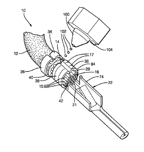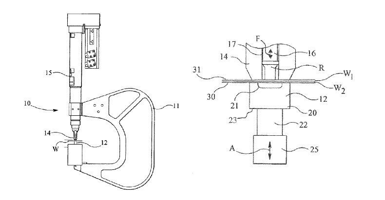 US9937548 — JOINING APPARATUS AND METHOD — Henrob Limited (GB) — A joint is produced in at least two overlapping workpieces, which may be sheet metal or otherwise, using a joining tool including a punch reciprocally disposed in a cylinder. The workpieces are disposed between the tool and a die. The tool applies a compressive force to deform the workpieces into a joint at a joining area between the tool and die. Continuous ultrasonic energy is applied to at least one of the workpieces in the joining area for at least part of the time during production of the joint to increase the ductility of at least one of the workpieces in the joining area. This induces an acoustic-plastic effect in the material being formed which temporarily reduces its strength so as to exhibit increased ductility. The joining method may be used in self-piercing riveting and clinching techniques and enables viable joints to be formed in high strength materials or thick sheets of material.