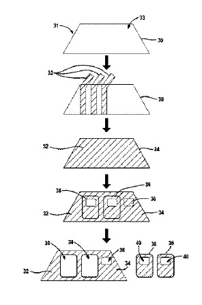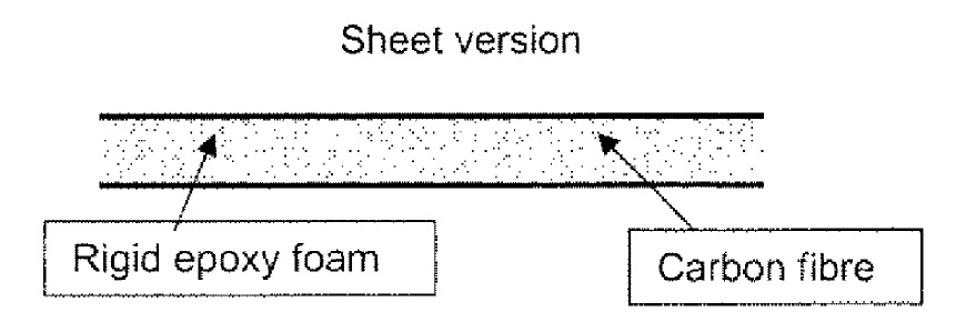 US10035326 — COMPOSITE MATERIALS — Zephyros, Inc. (USA) — Light weight composites with high flexural strength comprise epoxy foam sandwiched between two layers of facing material, which may be aluminum, have high strength and low weight and can be used to replace steel structures. Such composites are useful in the transportation industries to replace metal or fiber reinforced plastics in panels and reinforcements. The facing layer may be fibrous material especially glass or carbon fibers, the facing material is preferably embedded into the epoxy matrix. Alternatively, they may be matching box structures or concentric metal tubes. The sandwich structures may be prepared by laying up the fiber; coating and/or impregnating the layer with epoxy resin, laying a layer of heat activatable foamable epoxy material, providing a further layer of the fibrous material optionally coated and/or impregnated with epoxy resin on the foamable material and heating to foam and cure the epoxy materials. Alternatively, they may be formed by extrusion of the foamable material between the surface layers.