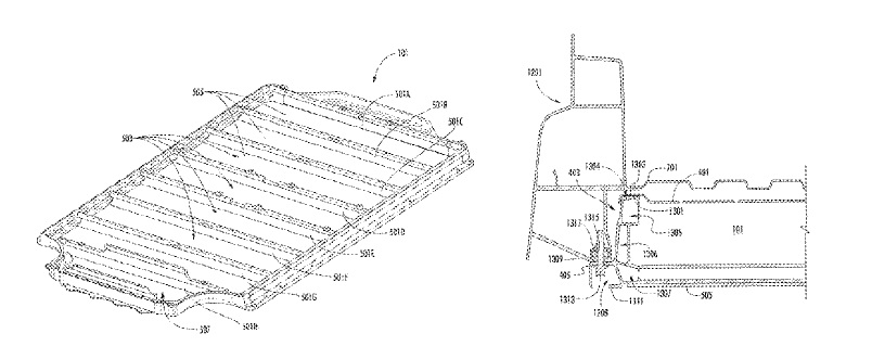 US10038173 — EXTRUDED BATTERY ENCLOSURE JOINT CONFIGURATION — GM Global Technology Operations LLC (USA) — An automotive battery pack enclosure, assembly and method of housing battery pack cells within an enclosure. The enclosure includes a tray that defines a mounting surface for the various individual battery cells, as well as an upstanding wall made of an aluminum alloy, while the assembly further includes numerous individual battery cells aligned along a stacking axis within the enclosure. The wall is made from a continuous extruded preform with periodically-spaced miters that permit bending such that the wall can assume any shape defined by the various panels. The panels cooperative with the peripheral edges of the tray to define a battery container with a footprint shape generally similar to that of the tray. By being formed from a substantially one-piece preform, all of the corners