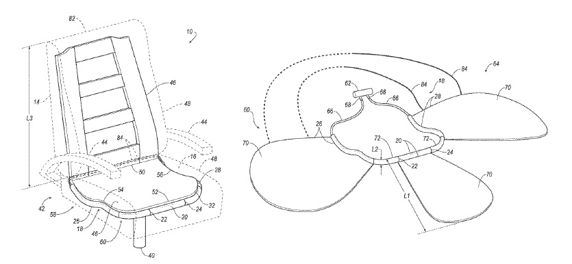 US10023146 — VEHICLE SEAT ASSEMBLY INCLUDING AIRBAG — Ford Global Technologies, LLC (USA) — A seat assembly for a vehicle includes a seatback and a seat bottom, the frame of each may be made of aluminum, extending away from the seatback. An airbag is supported by the seat bottom and includes a middle member having a first end and a second end. The middle member is spaced from the seatback. The airbag includes a first side member extending from the first end of the middle member toward the seatback, and a second side member extending from the second end of the middle member toward the seatback. When inflated in response to a sensed impact of the vehicle, the middle member, the first side member, and the second side member extend around the occupant. One leg of the occupant is disposed between the middle member and the first side member, and the other leg of the occupant is disposed between the middle member and the second side member.