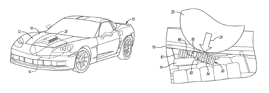 US10023239 — LOCAL ENERGY ABSORBER — GM Global Technology Operations LLC (USA) — A vehicle hood covering an underhood object includes an inner surface of the vehicle hood facing the underhood object and spaced from the underhood object, and an outer surface of the vehicle hood opposite the inner surface. A local energy absorber is operatively attached to the inner surface of the vehicle hood. The local energy absorber is a multiply-connected structure. The local energy absorber includes a wall defining an interior surface having symmetry about a central plane normal to the inner surface of the vehicle hood. A plurality of apertures is defined in the wall symmetrically about the central plane to initiate buckling and fracture in the wall during an impact applied to the outer surface defining an impact event having a duration of less than 20 milliseconds. The local energy absorber 20 may be fabricated by extruding the wall 40 as a single extrudate 45 through a die 44, then forming the plurality of apertures 50. In an example, the local energy absorber 20 may be formed from a magnesium alloy or an aluminum alloy.