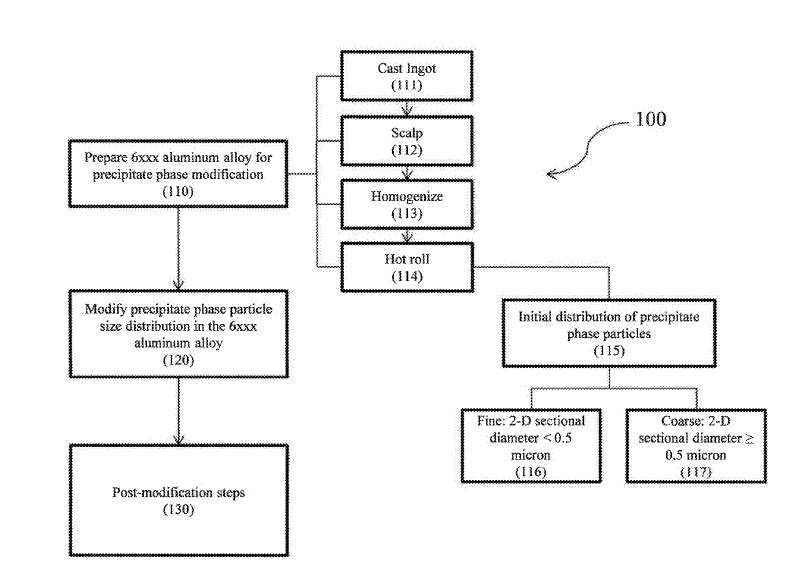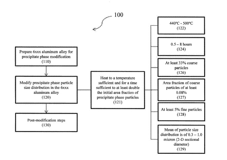 US10030295 — 6XXX ALUMINUM ALLOY SHEET PRODUCTS AND METHODS FOR MAKING THE SAME — Arconic Inc. (USA) — The present disclosure relates to methods for producing new 6xxx aluminum alloy sheet products having tailored precipitate phase particle size distributions. Generally, the new 6xxx aluminum alloy sheet products realize improved hemming response and/or decreased natural aging rate. The new 6xxx aluminum alloy sheet products may realize the improved properties by employing controlled, post-hot rolling conditions, thereby realizing a modified precipitate phase particle size distribution within the alloy. The modified precipitate phase particle size distribution generally realizes an increased proportion of coarse particles (2-D sectional diameter 0.5-2.0 microns), which are more resistant to dissolution during solution heat treatment. Correspondingly, the modified precipitate phase particle size distribution generally realizes a lower proportion of fine particles, which may dissolve during solution heat treatment. The tailored precipitate phase particle size distributions may be produced by preparing a 6xxx aluminum alloy sheet for precipitate phase modification, and then modifying an initial precipitate phase particle size distribution of the material. The modifying may include heating the intermediate gauge strip to a temperature of from 440˚C. (825˚F.) to 500˚C. (932˚F.) and for a time sufficient to create a modified strip product having a modified (tailored) precipitate phase particle size distribution. The modified strip product may realize improved properties.