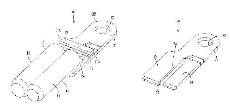 US10033116 — TERMINAL, TERMINAL-EQUIPPED ELECTRICAL WIRE, AND METHOD FOR MANUFACTURING TERMINAL-EQUIPPED ELECTRICAL WIRE — Autonetworks Technologies, Ltd., Sumitomo Wiring Systems, Ltd., and Sumitomo Electric Industries, Ltd. (Japan) — A terminal (20) includes a connecting portion (24) to which a plurality of wires (11, 12) including conductors (13, 14) having different thicknesses are to be connected side by side, and the connecting portion (24) is stepped. A terminal-wire assembly (10) includes a plurality of wires (11, 12) including conductors (13, 14) having different thicknesses and a terminal (20) including a connecting portion (24) to which the plurality of wires (11, 12) are to be connected side by side, and the connecting portion (24) is stepped. In the terminal-wire assembly (10), the wire (12) connected at a high position on the connecting portion (24) includes the thinner conductor (14) than the wire (11) connected at a low position on the connecting portion (24). The terminal is formed of a plate member made of metal such as copper, copper alloy, aluminum or aluminum alloy, and the surfaces of the metal plate member constituting the terminal 20 may be plated if necessary.