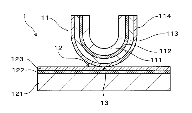 US10033124 — ELECTRICAL CONTACT PAIR AND CONNECTOR TERMINAL PAIR — AutoNetworks Technologies, Ltd., Sumitomo Wiring Systems, Ltd., and Sumitomo Electric Industries, Ltd. (Japan) — In recent years, following the spread of hybrid automobiles, electric automobiles, and the like, high-current connector terminals have been used for, for example, power supply lines for supplying electric power to a motor and the like. In the electrical contact pair, the first conductive base material and the second conductive base material may be made of copper or a copper alloy, or aluminum or an aluminum alloy. Typically, electrical contacts of this type of connector terminal employ Ag plating, which has low contact resistance. When the connector terminals are fitted to each other, the Ag layers of electrical contacts are brought into contact with each other, and a contact portion of a pair of electrical contacts is formed. An electrical contact pair and a connector terminal pair that can reduce the amount of sliding wear in a contact portion. The electrical contact pair includes a first electrical contact, a second electrical contact, and a contact portion. The first electrical contact includes, above a first conductive base material, an Ag-Sn alloy layer, and a first Ag layer that is laminated on a surface of the Ag-Sn alloy layer, and the first Ag layer is exposed as the outermost surface. The second electrical contact includes a second Ag layer above a second conductive base material, and the second Ag layer is exposed as the outermost surface. The contact portion is obtained as a result of a surface of the first Ag layer of the first electrical contact and a surface of the second Ag layer of the second electrical contact being in contact with each other.