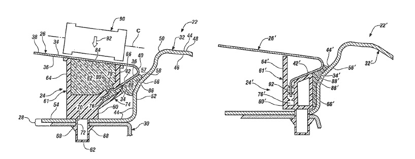 US10040484 — VEHICLE ROOF PANEL ATTACHMENT ASSEMBLY — GM Global Technology Operations LLC (USA) — A vehicle roof panel attachment assembly includes a substructure, a fastening device, a roof panel, and a side panel, all of which may be made of different materials. For example, the roof panel may be made of aluminum and the substructure of steel, while the side panel may be made of metal or plastic composite. The fastening device is engaged to the substructure and projects through an opening in the substructure. The roof panel includes a top portion spaced above the substructure, a flange, and a bend feature disposed between the top portion and the flange. The flange projects, at least in-part, downward from the bend feature and is engaged to the fastening device. The side panel includes an outer segment and an inner segment projecting, at least in-part, downward from the outer segment. A seam is carried by and between the bend feature and the inner segment.