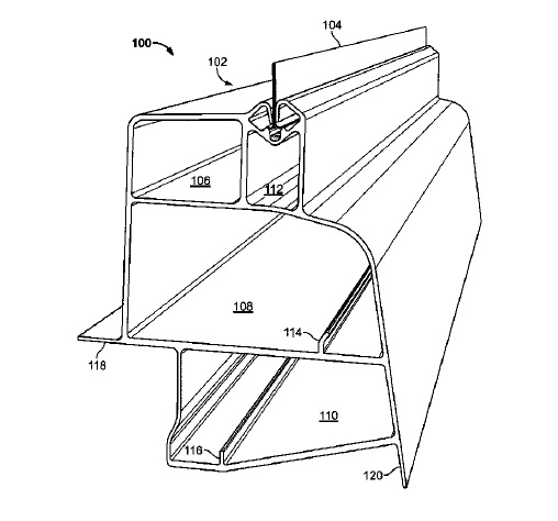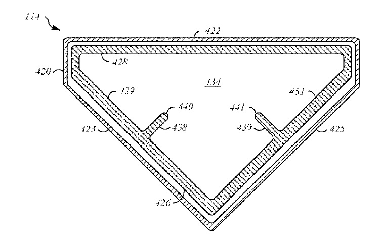 US9988094 — INTERNALLY STIFFENED BODY STRUCTURE — Apple Inc. (USA) — A vehicle body structure, includes a structural pillar that is located adjacent to a passenger compartment. The structural pillar has an elongate aluminum extrusion that has a peripheral wall that defines a closed cross-sectional shape. The peripheral wall has at least a first portion that is oriented toward the passenger compartment, and a stiffening structure that is connected to the first portion of the elongate aluminum extrusion.