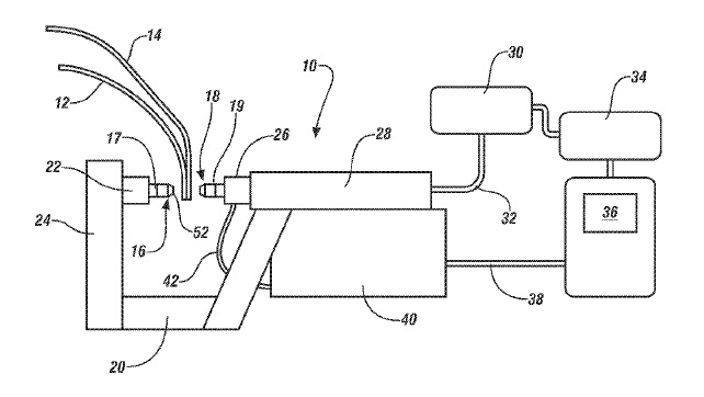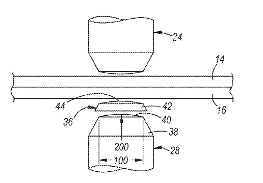 US10052710 — RESISTANCE SPOT WELDING STEEL AND ALUMINUM WORKPIECES USING ELECTRODE WELD FACE COVER — GM Global Technology Operations LLC (USA) — A method of resistance spot welding a steel workpiece and an aluminum or aluminum alloy (“aluminum”) workpiece together includes several steps. One step involves providing a workpiece stack-up with a steel workpiece and an aluminum workpiece. Another step involves attaching a cover over a weld face of a welding electrode. The cover is made of a metal material with an electrical resistivity that is greater than an electrical resistivity of a material of the welding electrode. Yet another step involves performing multiple individual resistance spot welds to the workpiece stack-up. The cover abuts the aluminum workpiece while the individual resistance spot welds are performed. The increased heat attributed to the cover better balances heat developed between the steel and aluminum workpieces and, it has been found, alters the solidification behavior of a weld joint produced in the aluminum workpiece in a way that precludes the undesirable accumulation of defects at and along a faying interface of the stack-up. It can also help reduce heating in the steel workpiece which, in turn, reduces growth of the brittle Fe-Al intermetallic layers at the faying surface. And another step involves removing the cover from the welding electrode after the individual spot welds are performed.