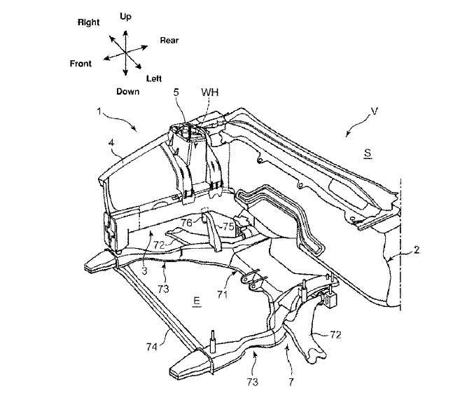 US9878743 — FRONT VEHICLE-BODY STRUCTURE OF VEHICLE — Mazda Motor Corporation (Japan) — A front vehicle body comprises a front frame, an apron reinforcement, and a suspension housing made of a die cast aluminum alloy. The suspension housing comprises first and second open cross-sections extending in a vehicle width direction and interconnecting the front frame and the apron reinforcement. The suspension housing includes first joint portions which are joined to an outer face of the front frame and second joint portions which are joined to an inner face of the front frame. The first joint portions and the second joint portions are arranged on an end portion of the suspension housing which is positioned on a front-frame side such that they are alternately aligned in a vehicle longitudinal direction.