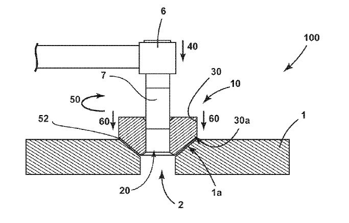 US10005120 — METHOD FOR FORMING A JOINT USING A SELF-PIERCING RIVET — Henrob Limited (GB) — A joint is formed in a stack of at least two sheets of light metal alloy, using a self-piercing rivet that is fully hollow. The rivet is coated at least along a portion of its bore by a lubricant and pierces the upper surface thereof and such that the shank deforms outwardly to interlock with the material but without penetration to the die side of the material. The outside diameter of the shank of the rivet is 5.4 mm or less. The die has a volume that is less than 60% or 70% of the effective solid volume of the rivet. The sheets may have an ultimate tensile strength in the range 50-600 MPa and preferably in the range 180 MPa-600 MPa. For example, they may be a high strength aluminum alloy having an ultimate tensile strength in the range 330-600 MPa. Alternatively, they may be made of a wrought magnesium alloy having an ultimate tensile strength in the range 180-440 MPa. It will be appreciated that the sheets of the joint may be made from different materials, with at least one of the sheets being a light metal alloy or each sheet in the stack being a light metal alloy but not necessarily the same as the other sheets in the stack.