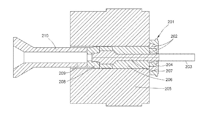 US10017659 — ROBUST SEALED ELECTRIC TERMINAL ASSEMBLY — Delphi Technologies, Inc. (USA) — A wire terminal assembly is disclosed in which a conductive terminal is connected to a conductive cable core along a conductive connection interface. Interest in weight savings and cost savings in various applications such as automotive electrical wiring applications have made aluminum- based cables an attractive alternative to copper-based cables. However, some wiring and electrical connectors may remain copper based. Thus, there may be a transition somewhere in the electrical circuit between an aluminum-based portion of the circuit and a copper-based portion of the circuit. A crimp interface connection of metal cable core (e.g., aluminum) to a different metal terminal (e.g., copper) can produce galvanic corrosion at the interface of the metal of lower nobility if an electrolyte such as salt water is present. To protect from moisture at electrical cable terminal connections, a coating is disposed over the conductive connection interface that is the product of a free radical polymerization reaction of a coating composition applied over the conductive connection interface, the coating composition including: (1) an oligomer comprising at least two active unsaturated bonds, (2) a monomer comprising an unsaturated bond, and (3) a compound comprising a plurality of thiol groups.