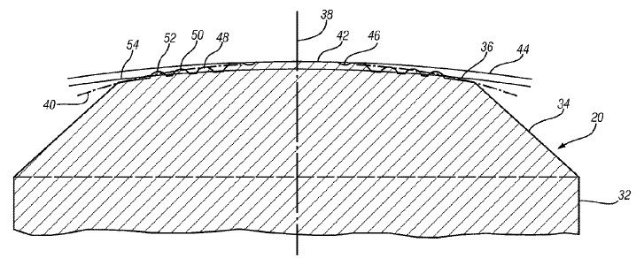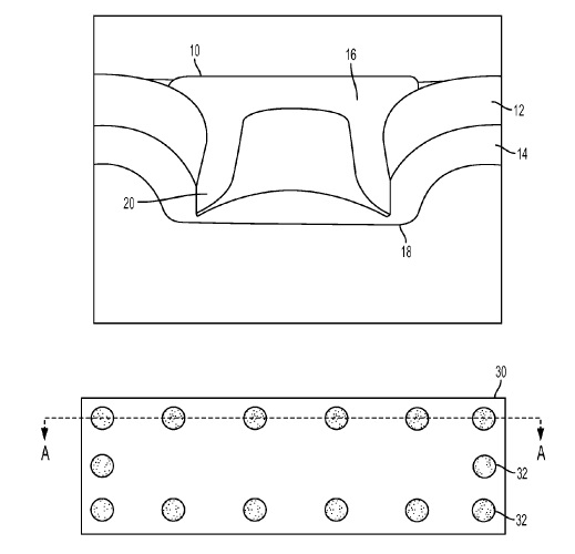 US9925617 — ELECTRODE FOR SPOT WELDING — GM Global Technology Operations LLC (USA) — Spot welding electrodes with generally dome shaped welding faces are provided with surface features for welding both aluminum alloy sheet assemblies and steel sheet assemblies. A raised circular plateau is formed on the central axis of the dome and, in one embodiment, a suitable number of round bumps are formed in concentric spacing from adjacent the circumference of the plateau toward the circular edge of the welding face. For welding steel workpieces the plateau mainly serves as the engaging feature of the electrode. Both the plateau and concentric bumps are used in penetrating light metal surfaces for suitable current passage. In another embodiment, the domed surface is shaped with concentric terraces for engagement with the workpieces.