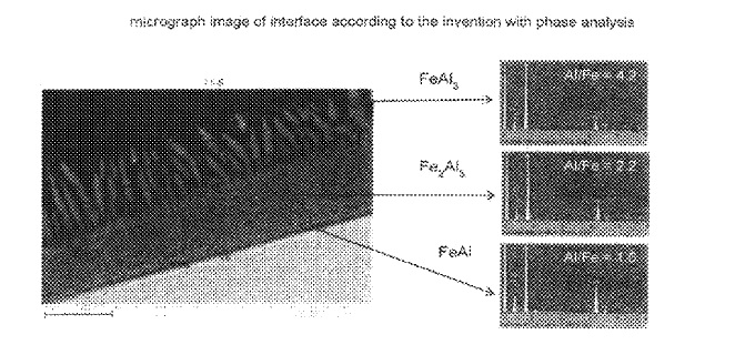 US9926619 — ALUMINUM ALLOY — Novelis Inc. (USA) — This invention concerns an aluminum alloy and sheet alloy product primarily intended for use in transportation vehicles. The aluminum alloy is based on the Al-Si-Cu system and is particularly suited for use as a sheet product useful in the manufacture of automobiles. The aluminum alloy is also suitable for use as a clad layer on a composite sheet. The invention also concerns a joined structure comprising a steel component and an aluminum component. In a first aspect, the invention provides aluminum alloy comprising the following composition, all values in weight %: Si 0.25-1.5 Cu 0.3-1.5 Fe up to 0.5 Mn up to 0.1 all other elements including Mg being incidental and present (if at all) then in an amount less than or equal to 0.05 individually, and less than or equal to 0.15 in aggregate, the balance being aluminum. In a second aspect, the invention provides a composite aluminum sheet product comprising a core layer and at least one clad layer wherein the at least one clad layer is an aluminum alloy comprising the following composition, all values in weight %: Si 0.25-1.5 Cu 0.3-1.5 Fe up to 0.5 Mn up to 0.1 all other elements including Mg being incidental and present (if at all) then in an amount less than or equal to 0.05 individually, and less than or equal to 0.15 in aggregate, the balance being aluminum. In a third aspect, the invention provides a method of making a joined structure of a steel component and an aluminum component made from the alloy and/or the sheet product of the invention.