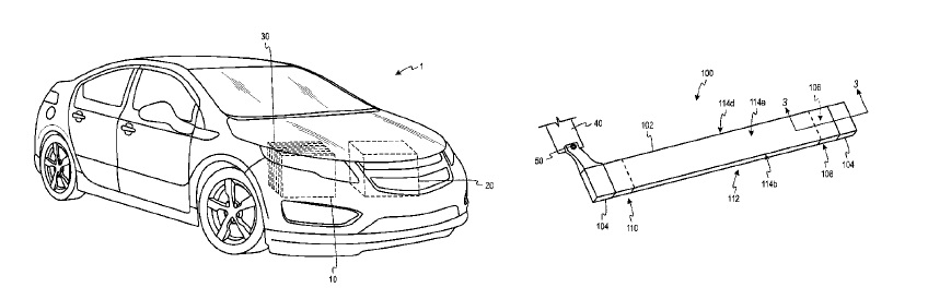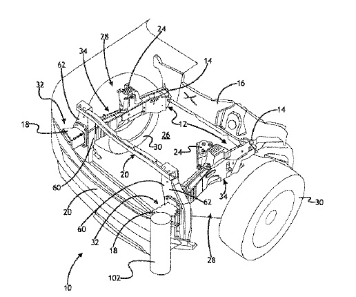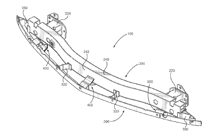 US9932004 — VEHICLE ENERGY ABSORPTION SYSTEM — Honda Motor Co., Ltd. (Japan) — A sensor bracket assembly is configured to extend between a sensor beam and a bumper beam of a vehicle. The sensor bracket assembly can include a bracket first section that is configured to be directly or indirectly connected to the bumper beam. The sensor bracket assembly can also include a bracket second section that is configured to be directly or indirectly connected to the sensor beam. The sensor bracket assembly can further include a spacer section that projects from the bracket first section and is configured to extend towards but be spaced from the bracket second section and the bumper beam. The exemplary energy absorbing structure can include a series of aluminum extrusions welded to the front bumper beam of a vehicle.