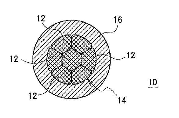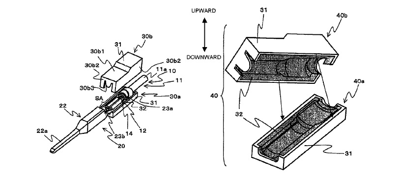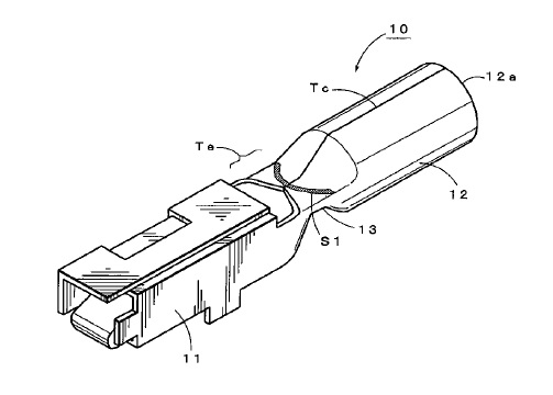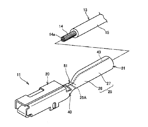 US9935392 — ELECTRIC WIRE AND TERMINAL CONNECTING CONSTRUCTION AND FABRICATION METHOD THEREOF — Yazake Corporation (Japan) — Aluminum corrodes easily in the presence of water and copper ions, and this causes a problem that a core made of aluminum corrodes easily when water infiltrates into a connecting portion where an aluminum wire core is connected with a copper terminal, as in an automotive vehicle circuit. An electric wire made of aluminum and a terminal connecting construction has an electric wire having an insulation covering portion where a conductor portion is covered with an insulation material and a conductor exposed portion where the insulation material on an end portion of the electric wire is removed, a terminal including a crimping portion crimped to the conductor exposed portion to thereby be connected to the electric wire, and a seal portion covering the conductor exposed portion exposed from the terminal, wherein the seal portion has an external resin portion forming an outer surface side of the seal portion and made from a thermoplastic resin and an internal resin portion made from a thermoplastic resin of which a fusing point is lower than that of the external resin portion and forming an inner surface side of the seal portion, and is divided so as to be attached to the conductor exposed portion.