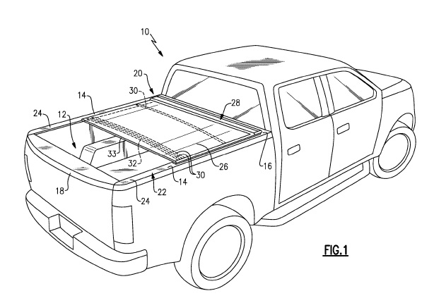 US9944216 — AUTOMATED SOFT TONNEAU COVER — BOS Automotive Products, Inc. (USA) — A retractable cover system includes a frame that provides an opening and includes laterally spaced apart guide rails and includes a drive system. A flexible cover has laterally opposing edge portions with intermittent retainers received in the guide rails. The retainers are configured to slide relative to the guide rails between first and second positions within the opening in response to actuation of the drive system. Multiple spaced apart bows extend laterally between guide rails. The bows provide a laterally and outwardly extending arc that maintains tension on the flexible cover laterally between the retainers. Each guide rail arrangement is formed by a two-piece hollow profile made from lightweight metal alloy, preferably an aluminum extruded profile, or from a suitable plastic material. The hollow profile comprises a lower structure section and an upper covering section which are detached from one another or can be connected to one another along an approximately horizontal dividing plane.
