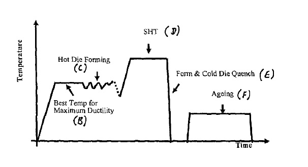 US9950355 — METHOD OF FORMING A COMPONENT OF COMPLEX SHAPE FROM SHEET MATERIAL — Imperial Innovations Limited (GB) — It is generally desirable that components used in automotive and aerospace applications be made as light as possible. Lighter components contribute to lowering the overall weight of an automobile or aircraft and so assist in improving fuel economy. The use of lightweight components may also provide other advantages such as, in automotive applications, improved handling performance, and, in aerospace applications, allowing a heavier load to be carried. For these reasons, it is desirable to make components for such applications from lightweight alloys, such as aluminum alloys (Al-alloys) or magnesium alloys (Mg-alloys). A method of forming a component of complex shape from an Al-alloy sheet or a Mg-alloy sheet includes the steps of: a) heating the sheet to a temperature below the solution heat treatment (SHT) temperature for the alloy; b) forming the heated sheet between heated dies into or towards the complex shape; c) heating the sheet to at least its SHT temperature and substantially maintaining that temperature until SHT has been completed; and d) quenching the solution heat treated sheet between cold dies and at the same time completing the forming into the complex shape or maintaining that shape.