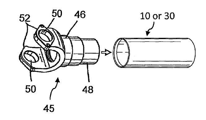 US9956645 — TUBE PROFILE MACHINING PROCESS — Dana Automotive Systems Group, LLC (USA) — In a first embodiment, at a time of magnetic pulse welding, a stepped tube profile machining process, wherein the end fitting and drive shaft tube comprise a high strength aluminum alloy, axially bores a walled tube from an end inward to a transition depth to form a section with a reduced wall thickness and then axially bores the walled tube from the transition depth to a fall off depth, thereby forming a section with a maximized welding wall section. In a second embodiment, also at a time of magnetic pulse welding, a surface angle tube profile machining process axially bores at a surface angle a walled tube from an end to a bore length to form an angular welding wall thickness inward to a maximized wall section. For both embodiments, the bored surfaces are virgin with no pits, oil, residue, or oxidation thereon, thus making the machined walled tubes available for immediate magnetic pulse welding.