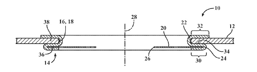 US9964175 — HEAT AND VIBRATION MOUNTING ISOLATOR FOR A HEAT SHIELD, HEAT SHIELD ASSEMBLY AND METHOD OF CONSTRUCTION THEREOF — Federal-Mogul LLC (USA) — An isolator for damping heat and vibrations between a heat shield and heat source is provided. The isolator includes a housing, preferably made of aluminum, and a washer. The housing surrounds a center opening and extends axially from a first end portion to a second end portion and includes an intermediate portion therebetween. The housing has a serpentine shape. The first end portion and the intermediate portion of the housing clamp a washer therebetween, and the second end portion and the intermediate portion of the housing clamp the heat shield therebetween. The washer includes a plurality of through openings between an outer periphery and the center opening for enhancing vibration dampening and minimizing heat transfer from the heat source to the heat shield. The isolator optionally includes a collar member disposed along the center opening of the washer to facilitate mounting of the isolator to the heat source.