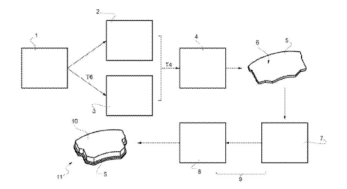 US9970494 — METHOD FOR THE PRODUCTION OF BRAKE PADS AND ASSOCIATED BRAKE PAD — ITT Italia S.r.l. (Italy) — Method for the production of braking elements for vehicles, in particular brake pads, including a die forming step by means of fine and/or traditional shearing of a metal support and a molding step upon the metal support of a block of friction material; the friction material is selected from the group of asbestos free materials, while the metal plate is made of an aluminum alloy selected from the group consisting of aluminum alloys subjected to precipitation hardening (age-hardening alloys) and is made from the fine and/or traditional shearing of a metal sheet when the alloy is in a solubilized state; the alloy, being aged during a friction material baking step, gains its mechanical properties needed for its operation.