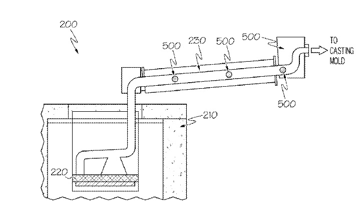 US9981310 — DEGASSING AND MICROSTRUCTURE REFINEMENT OF SHAPE CASTING ALUMINUM ALLOYS — GM Global Technology Operations LLC (USA) — A degassing and grain refinement system for a cast aluminum-based component and a method of achieving both hydrogen gas presence reduction and grain size reduction in a cast aluminum-based component. Ultrasonic vibrations are imparted to both the liquid metal travel path from its source to the mold to achieve the reduction in hydrogen gas in the molten metal, as well as to one or more locations within the mold to achieve relatively small and equiaxed grains in the component upon solidification.