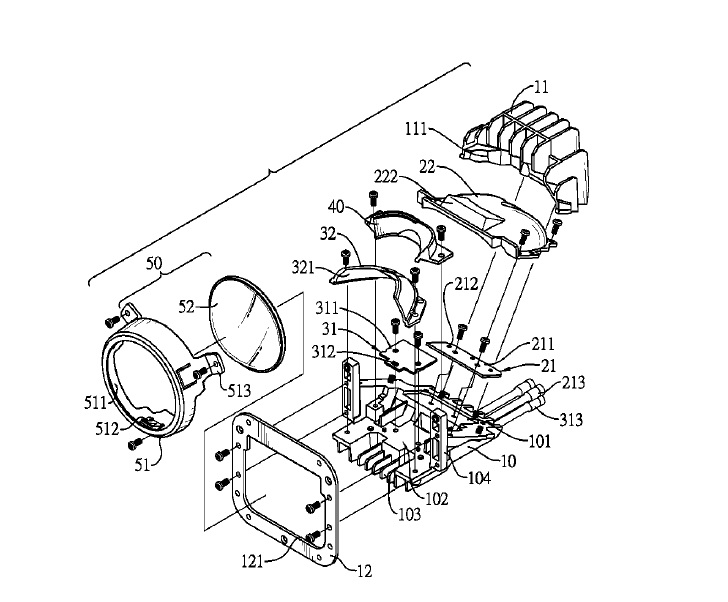 US9989210 — MODULARIZED HEADLIGHT — Yujing Technology Co., Ltd. (Taiwan) — A modularized headlight has a heat sink base, a lens assembly on a front end of the heat sink base, which can be made of aluminum, a first illuminating module and a first reflector on a first stage of the heat sink base, a second illuminating module and a second reflector on a second stage of the heat sink base, and a shading component on the first stage. When the first illuminating module is emitting light, the light beams are reflected by the first reflector toward the lens assembly through the shading component to provide a low beam mode. When the second illuminating module is emitting light, the light beams are reflected by the second reflector toward the lens assembly to provide a high beam mode. The modularized headlight is switched between the two modes without mechanical mechanism so that components of the modularized headlight may not be worn out and durability is improved.