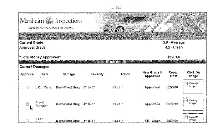 US9990662 — COMPUTER-BASED TECHNOLOGY FOR AIDING THE REPAIR OF MOTOR VEHICLES — Manheim Investments, Inc. (USA) — A computer-assisted inspection system provides computer architectures and software controlled algorithms to automatically provide vehicle inspections and repair recommendations including estimated repair time and cost of depression type damage such as dents. Features provided by a handheld wireless touchscreen based inspection device include flat car part picking, auto grading including seller grading, and automatic calculation of body and bumper dent repair parameters and directions.