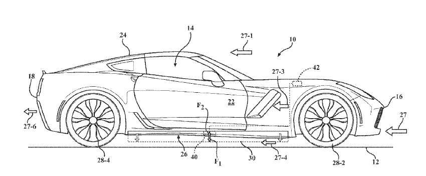 US9994267 — ACTIVE SIDE-SKIRTS FOR A MOTOR VEHICLE — GM Global Technology Operations LLC (USA) — A side-skirt system for a vehicle to increase aerodynamic performance includes first and second side-skirts. The vehicle includes a vehicle body having a first body end facing oncoming ambient airflow when the vehicle is in motion, an opposing second body end, and first and second lateral body sides spanning a distance between the two body ends. The vehicle also includes at least one first road wheel proximate the first body end and at least one second road wheel proximate the second body end. The first and second side-skirts are mounted to the respective first and second lateral body sides between the respective first and second road wheels and configured to adjust respective magnitudes of aerodynamic disturbance at the lateral body sides when the vehicle is in motion. The system also includes a mechanism configured to shift the first and second side-skirts relative to the vehicle body and adjust the respective magnitudes of aerodynamic disturbance.