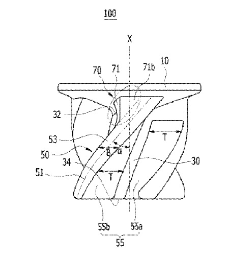 US9995329 — SELF-PIERCING RIVET — Sungwoo Hitech Co., Ltd. (Korea) — A self-piercing rivet is disclosed having advantages of easy separation of the rivet by improving a shape of a shank portion. A self-piercing rivet according to an exemplary embodiment of the present invention may be applied for the joining of aluminum sheet and plate and may include: a head portion; a shank portion integrally connected with the head portion; a plurality of ribs formed to an external circumferential surface of the shank portion along a length direction of the shank portion in a spiral form and integrally connected to the head portion; and a straight portion integrally formed in a connecting portion in which the head portion and 50 are connected.