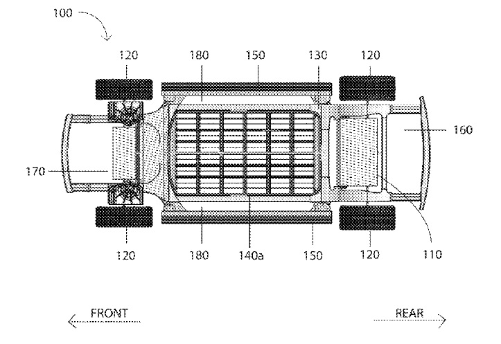US10023038 — SYSTEM FOR ABSORBING AND DISTRIBUTING SIDE IMPACT ENERGY UTILIZING AN INTEGRATED BATTERY PACK — Tesla Motors, Inc. (USA) — An energy absorbing and distributing side impact system for a vehicle includes: first and second side sills or rocker panels, preferably formed from extruded aluminum, each of the first and second sills comprising multiple longitudinal channels, at least an upper longitudinal channel positioned above a vehicle floor panel and at least a lower longitudinal channel positioned below the vehicle floor panel; a battery enclosure mounted between front and rear suspensions of the vehicle, the battery enclosure having a first side member attached to the first side sill, and a second side member attached to the second side sill; cross-members integrated into the battery enclosure; and one or more bolts each extending though a respective opening in one of the cross-members and extending to an opposite side of the vehicle floor panel from the cross-member, which may be made of an aluminum extrusion.
